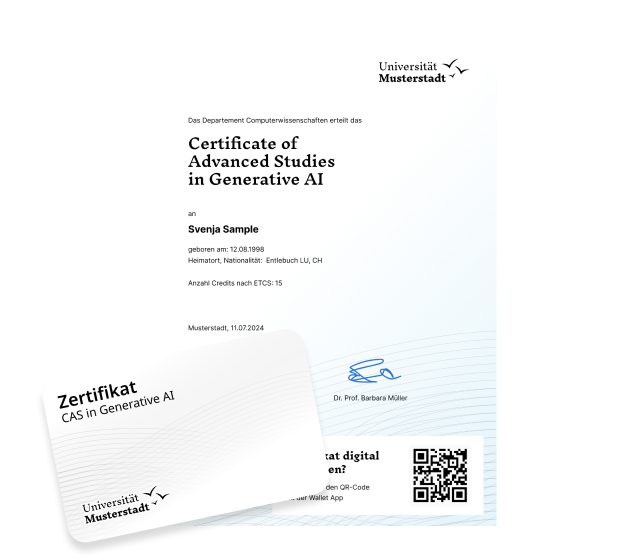 Mit dem QR-Code auf dem gedruckten Zertifikat und ihrem Uni-Login, kann sich Svenja das CAS Zertifikat als digitalen Nachweis in die Wallet-App ausstellen lassen.